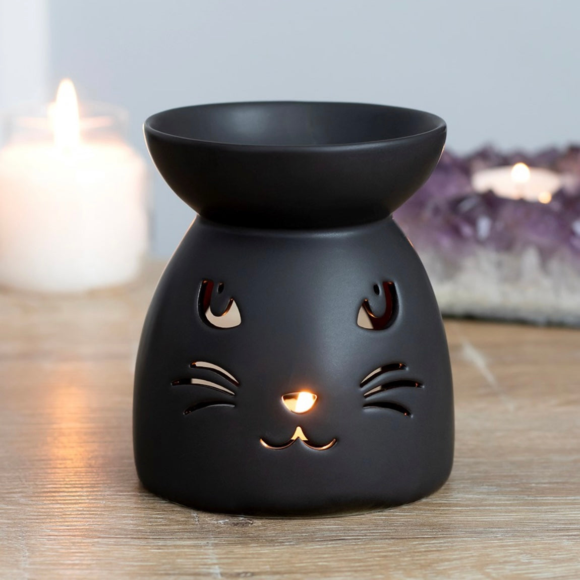 Coloca una velita de té en la parte inferior y tu wax melt o aceite aromático favorito arriba. Mientras el aroma se extiende, la silueta del gato se ilumina suavemente creando una atmósfera cálida, acogedora y muy especial.